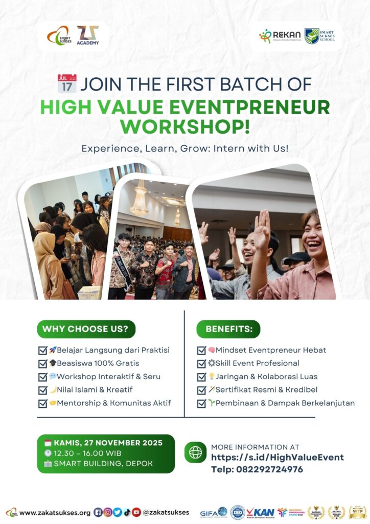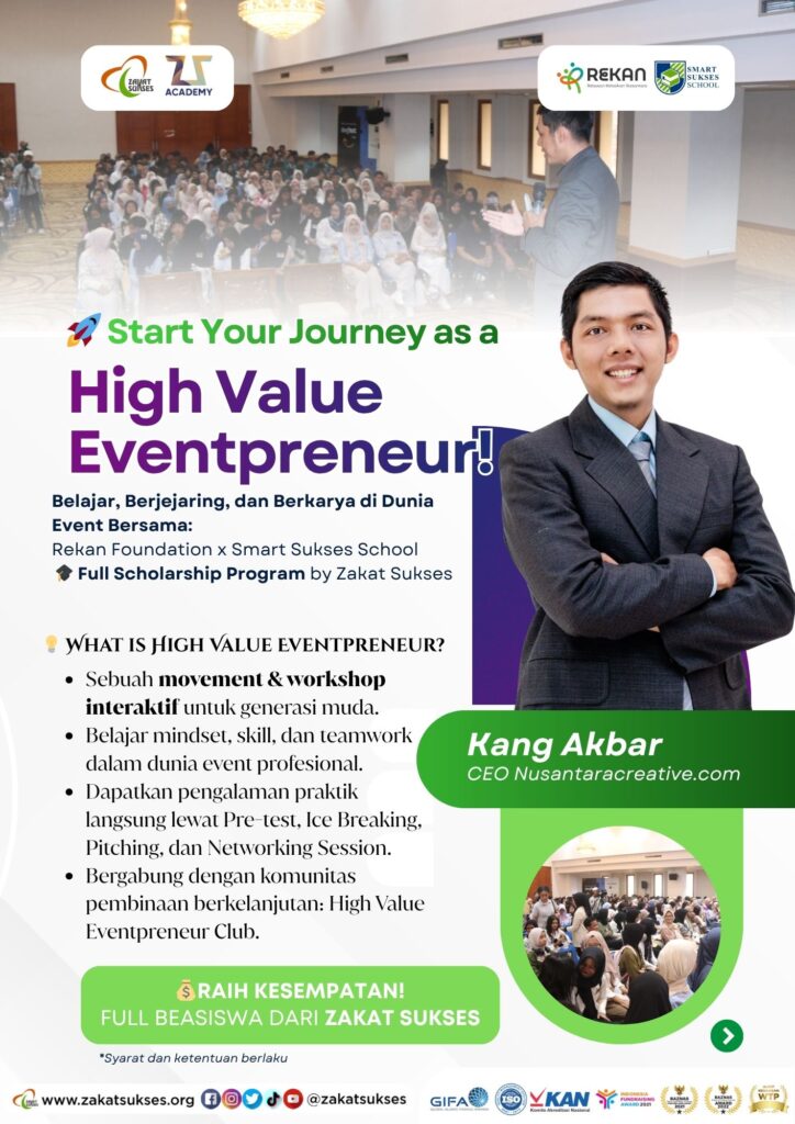 Semangat inilah yang dihadirkan dalam Workshop “High Value Eventpreneur”, hasil kolaborasi Rekan Foundation, Nusantara Creative Hub, dan Smart Sukses School, dengan dukungan penuh LAZ Zakat Sukses.